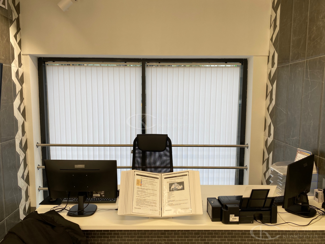 Вертикальные тканевые жалюзи — недорогой вариант солнцезащитной системы для дома или офиса. Они хорошо защищают помещение от солнца. Недостатком такой системы считаются быстрая поломка при неаккуратном обращении и загрязнение ткани при проветривании помещения. Но если очистить от грязи и пыли их не получается, то задача решается путем недорогой замены ламелей. Из преимуществ можно отметить огромный выбор цветов и фактуры, а также возможность нанесения фотопечати: картинки или логотипа. Бесплатный замерщик поможет выбрать модель и определиться с решением. Персональный менеджер поможет сделать предварительный расчет.